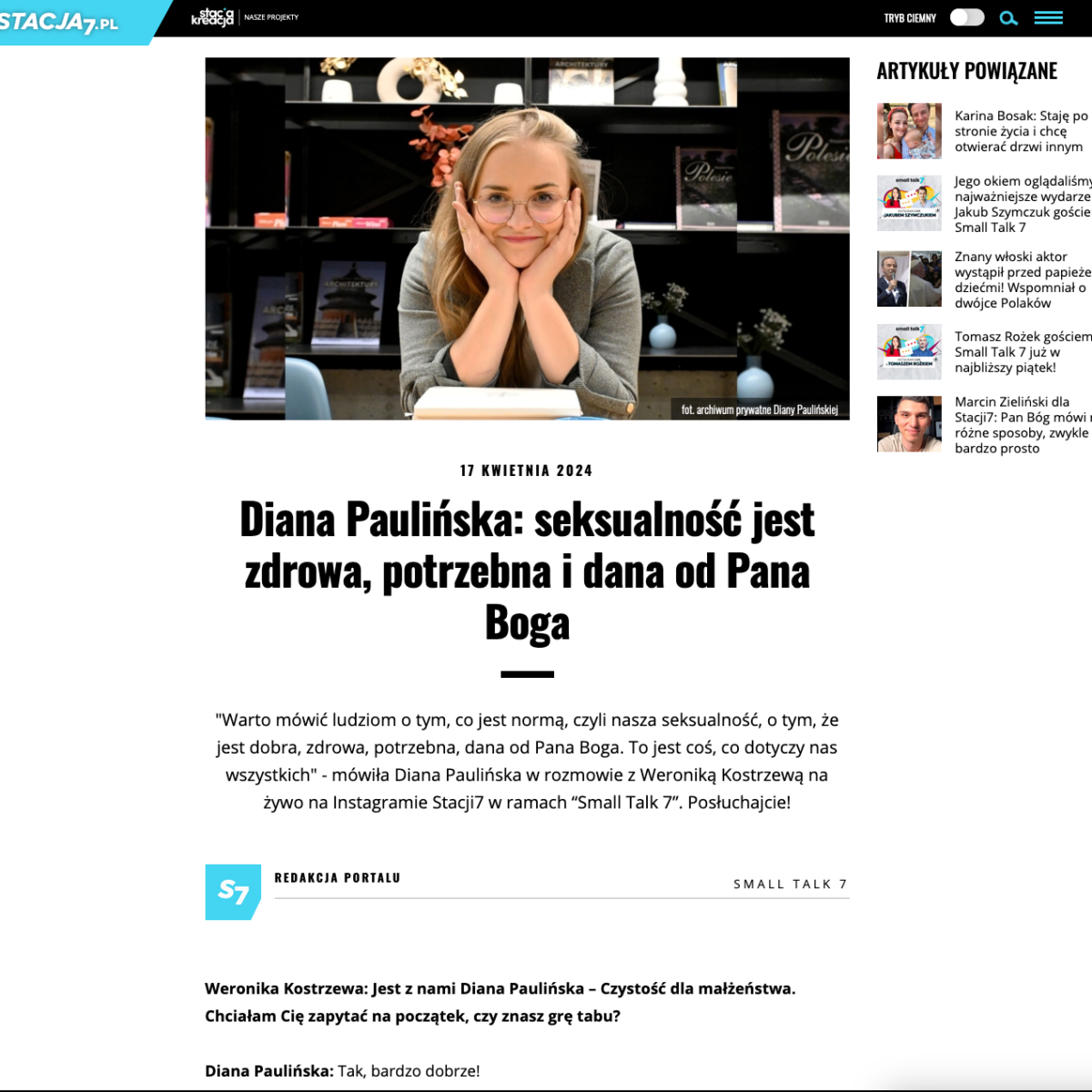 „Warto mówić ludziom o tym, co jest normą, czyli nasza seksualność, o tym, że jest dobra, zdrowa, potrzebna, dana od Pana Boga. To jest coś, co dotyczy nas wszystkich” – mówiła Diana Paulińska w rozmowie z Weroniką Kostrzewą na żywo na Instagramie Stacji7 w ramach “Small Talk 7”. Posłuchajcie!